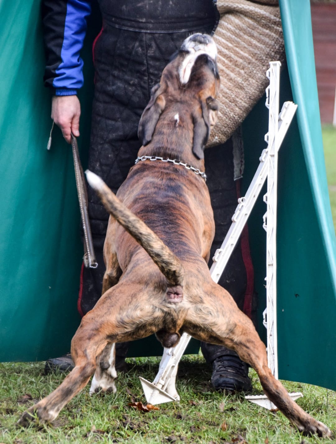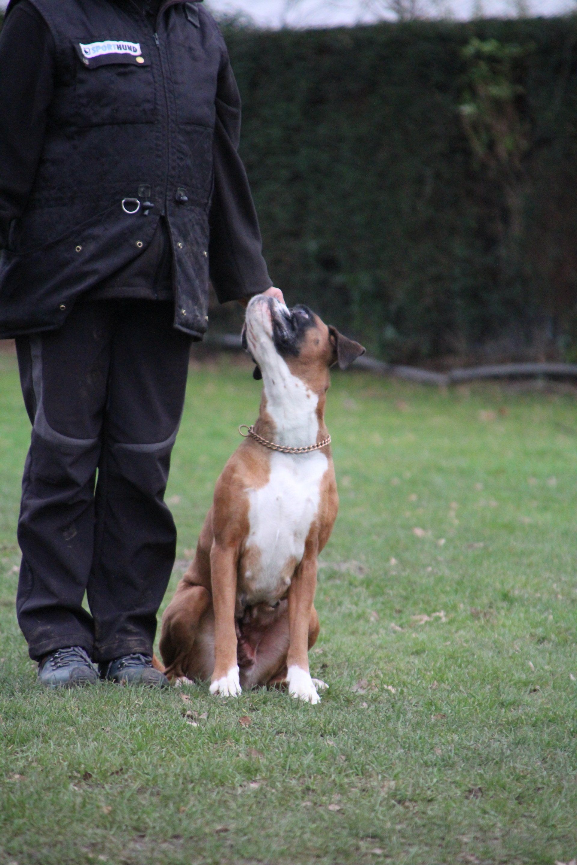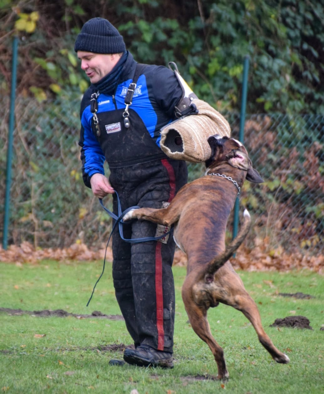 Mit dem bald 4 Jahre alten Boxerrüden Rick trainieren Marco und Lisa in Unterordnung, Schutzdienst und Fährte.